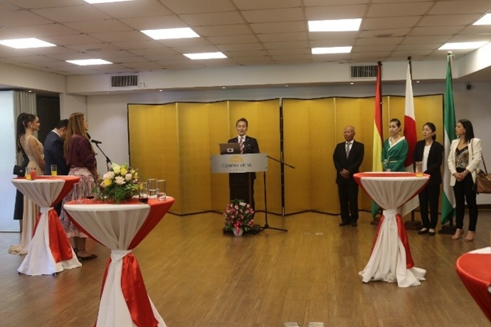 Además, el Gobernador de Santa Cruz, Sr. Luis Fernando Camacho, quien no pudo asistir a la recepción debido al trabajo por desastre ocurrido en el municipio de El Torno, envió un mensaje (leído en su nombre por la Directora de Cooperación y Relaciones Internacionales del Departamento de Santa Cruz, Lic. Antelo) indicando: "Me gustaría expresar mi gratitud por el apoyo de Japón a Bolivia y las contribuciones de los descendientes japoneses a la agricultura boliviana, así como por la dedicación del Embajador Onomura para fortalecer la relación amistosa y de cooperación entre Japón y el Departamento de Santa Cruz".