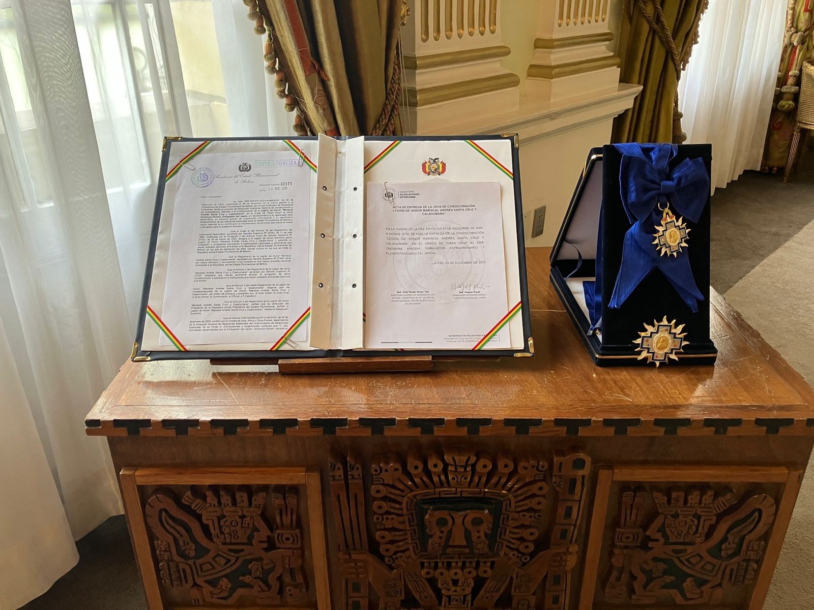 12月23日、在任中の両国関係強化への貢献に対して、「Legion de Honor Mariscal Andres Santa Cruz y Calahumana」大十字勲章がボリビア政府から小野村大使に授与されました。