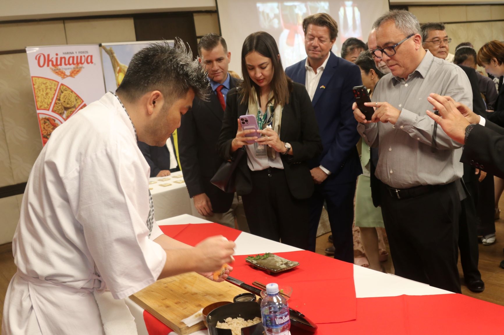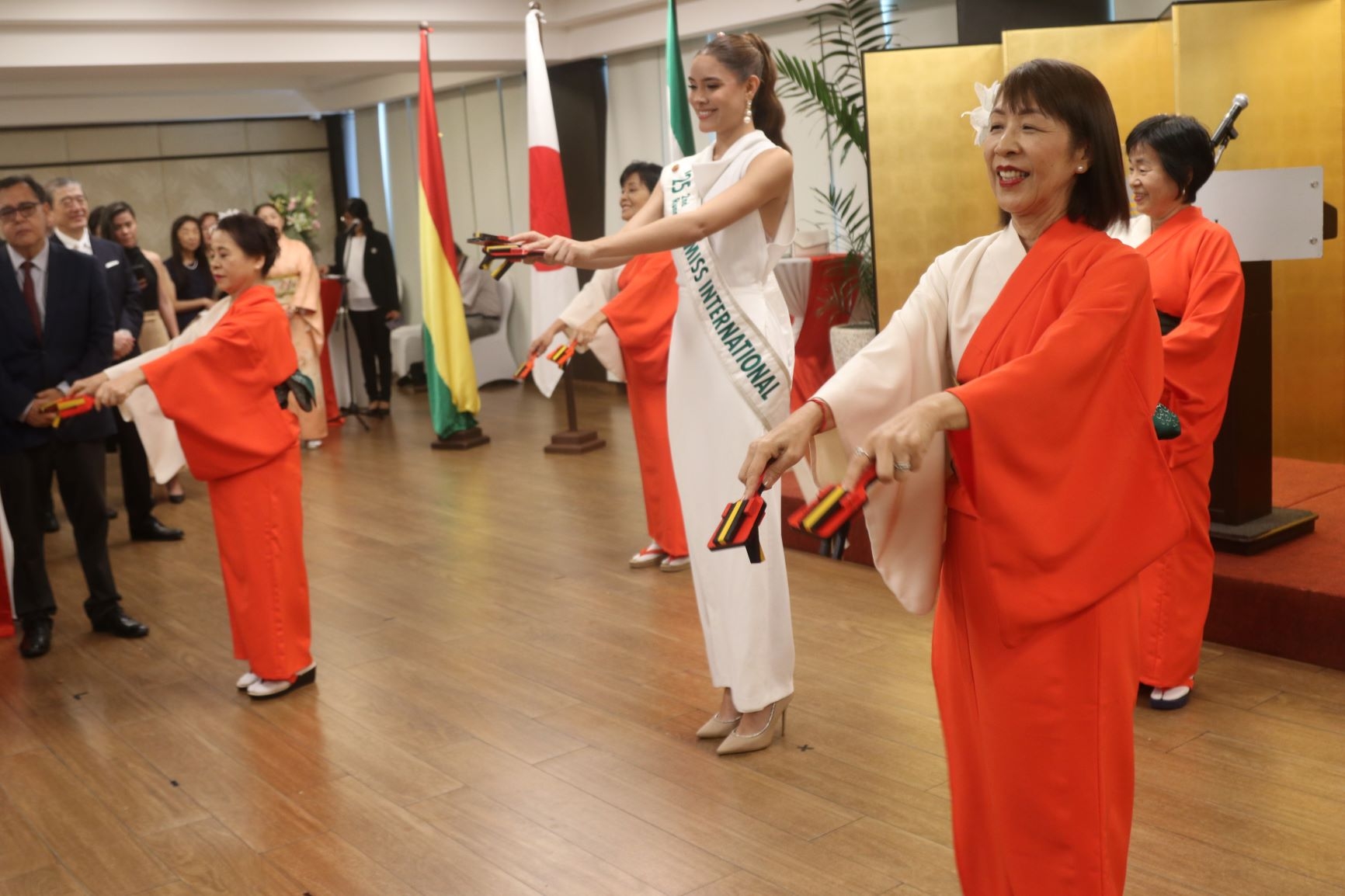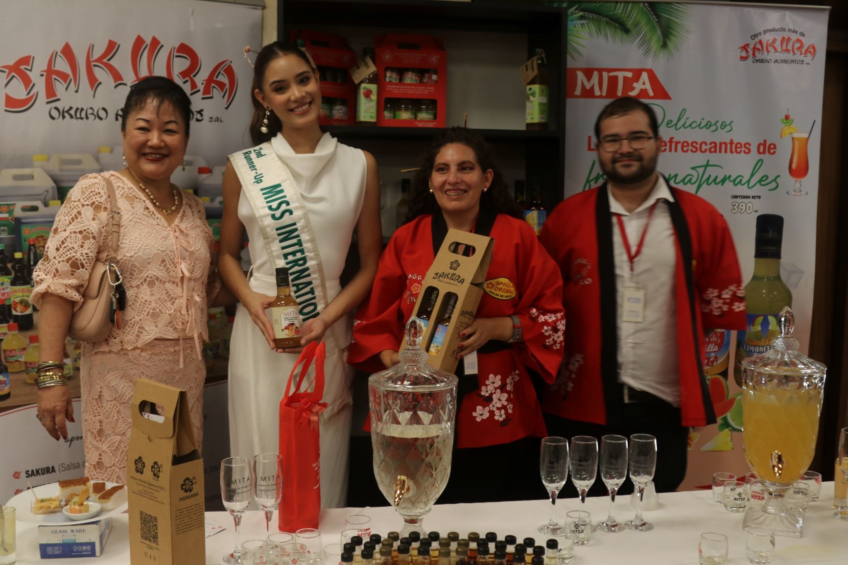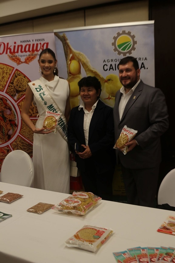 会場では、寿司のデモンストレーションや日本酒の試飲会が行われたほか、サンファン、オキナワ両移住地農協組合やサンタクルスの日系企業の商品紹介が行われました。また、長年サンタクルス領事事務所で勤務された杉本行子氏への叙勲や、サンタクルス中央日本人会婦人部による踊り、2025年11月に日本で開催されたミス・インターナショナルで見事第3位に輝き、日本政府から観光特使に任命されたパオラ・グスマン氏による訪日体験報告も合わせて行われました。