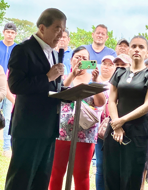 2月11日、折原大使はオキナワ移住地にて、ルイス・フェルナンド・カマチョ・サンタクルス県知事、ルベン・ダリオ・メルカド・オキナワ市市長、宮本義弘JICAボリビア事務所長、オキナワ移住地関係者等とともに、「オキナワ道路整備計画第2フェーズ」の起工式に出席しました。当プロジェクトは、オキナワ第二・第三移住地をつなぐ幹線道路11.5キロを建設するもので、折原大使は、長く待ち望まれてきたオキナワ移住地そしてボリビア全体にとって重要なプロジェクトが着工されることを嬉しく思うと述べました。カマチョ・サンタクルス県知事は、この道路舗装によって、近隣住民、コミュニティ、そして自治体全体に恩恵をもたらし、生活環境が向上されることを期待すると述べ、地域を支える生産者にとって極めて重要なこのプロジェクトを可能にした日本の協力に謝意を表明しました。